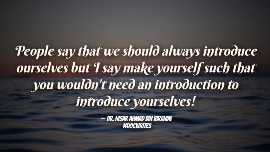 People say that we should always introduce ourselves but I say make yourself such that you wouldn't need an introduction to introduce yourselves! ― Dr. Nisar Ahmad bin Ibrahim Those who work for Allah they don't need name and fame. #LetYourWorkSpeak #DocWrites