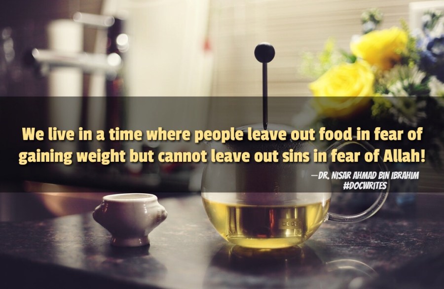 We live in a time where people leave out food in fear of gaining weight but cannot leave out sins in fear of Allah! ― Dr. Nisar Ahmad bin Ibrahim #DocWrites