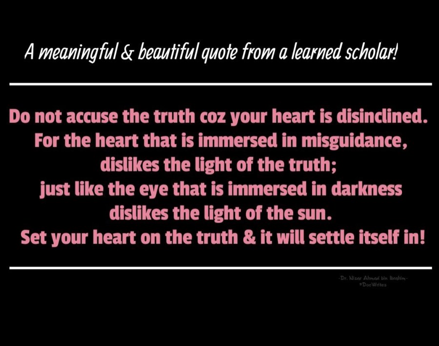 Do not accuse the truth coz your heart is disinclined. For the heart that is immersed in misguidance, dislikes the light of the truth; just like the eye that is immersed in darkness dislikes the light of the sun. Set your heart on the truth & it will settle itself in! A beautiful & a …
