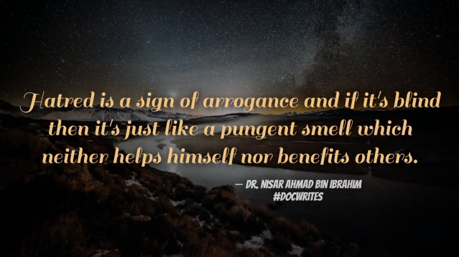 Hatred is a sign of arrogance and if it's blind then it's just like a pungent smell which neither helps himself nor benefits others. ― Dr. Nisar Ahmad bin Ibrahim #LovePeople #HateBadDeedsOnly #DocWrites